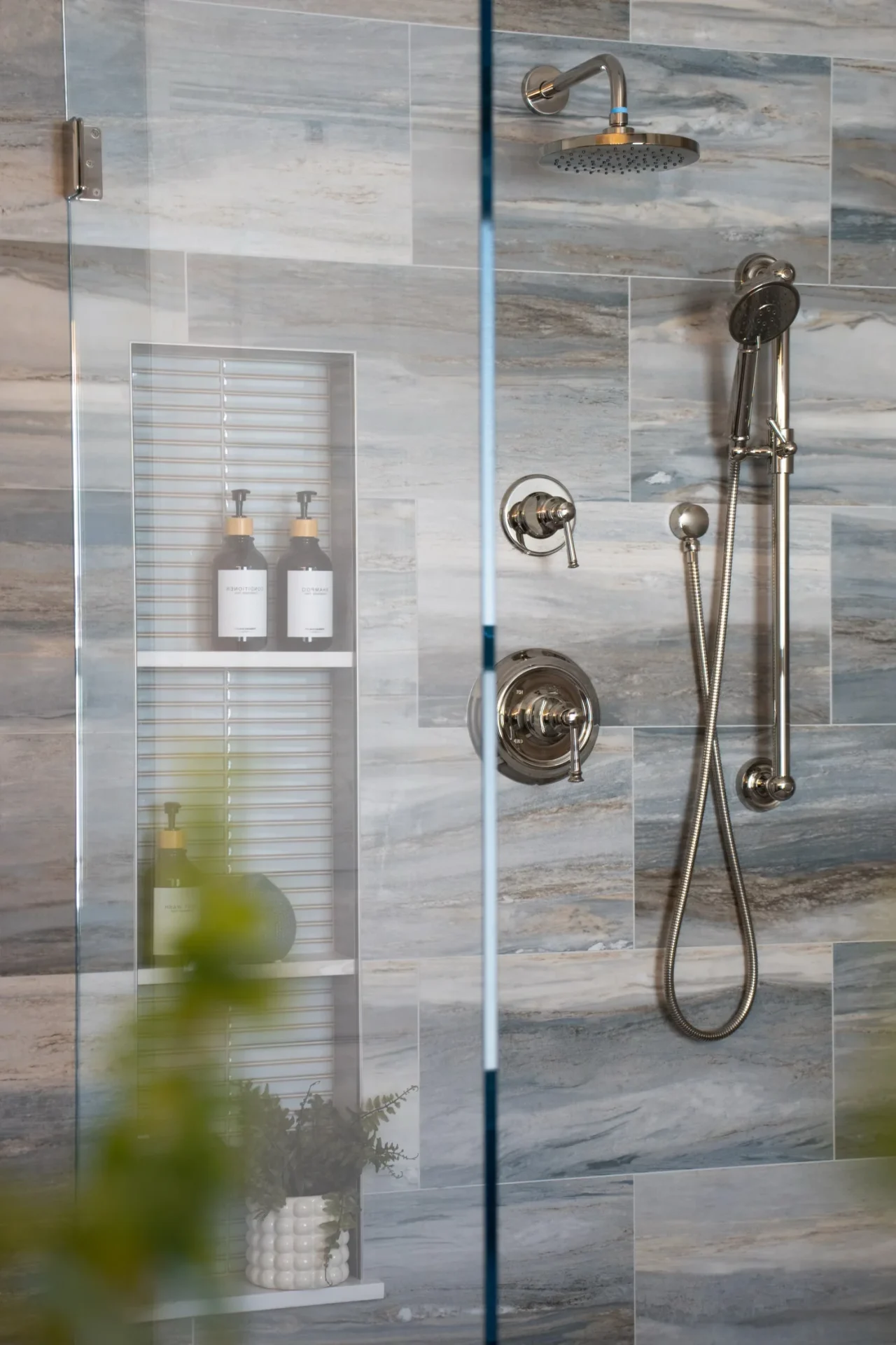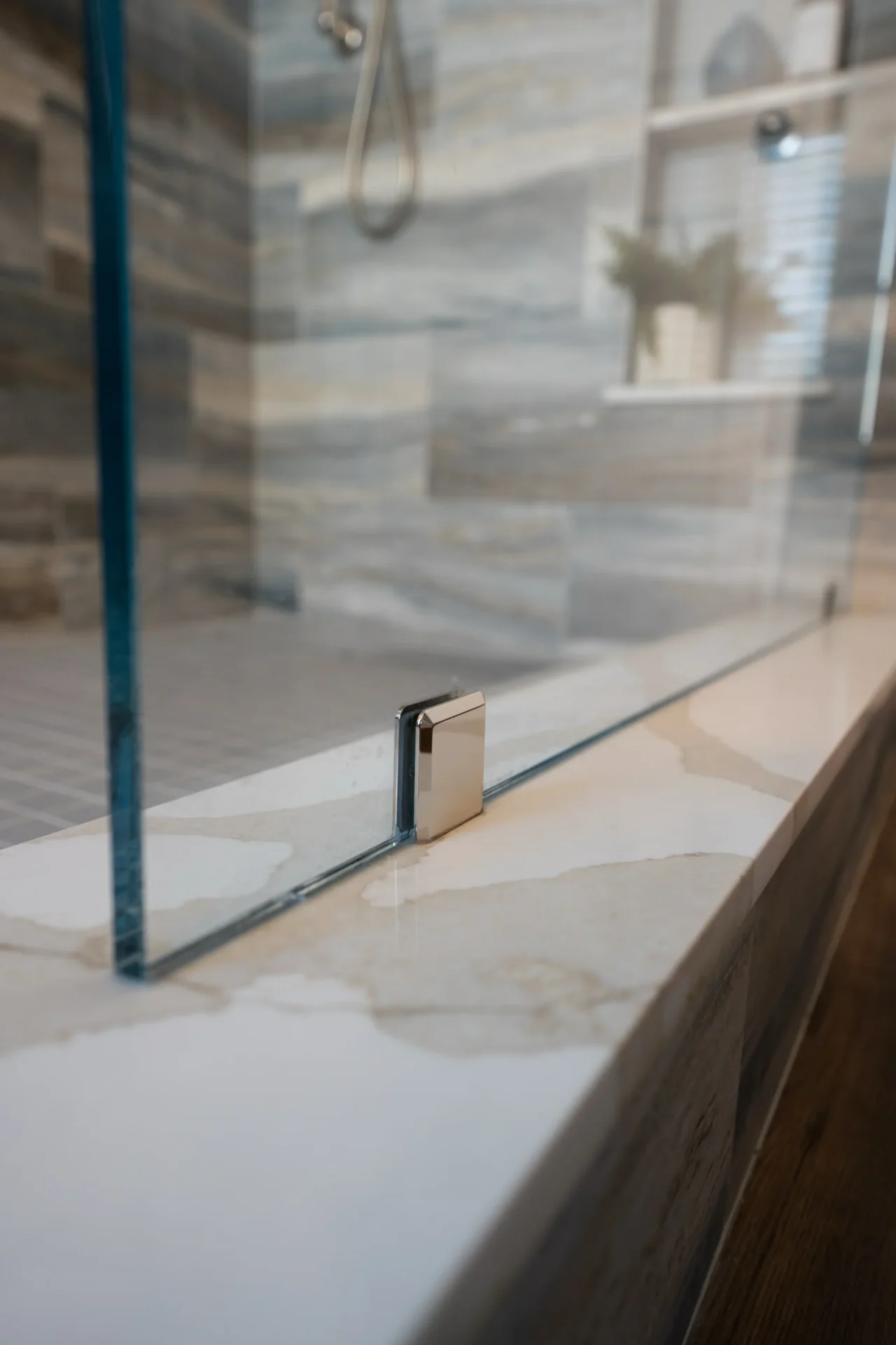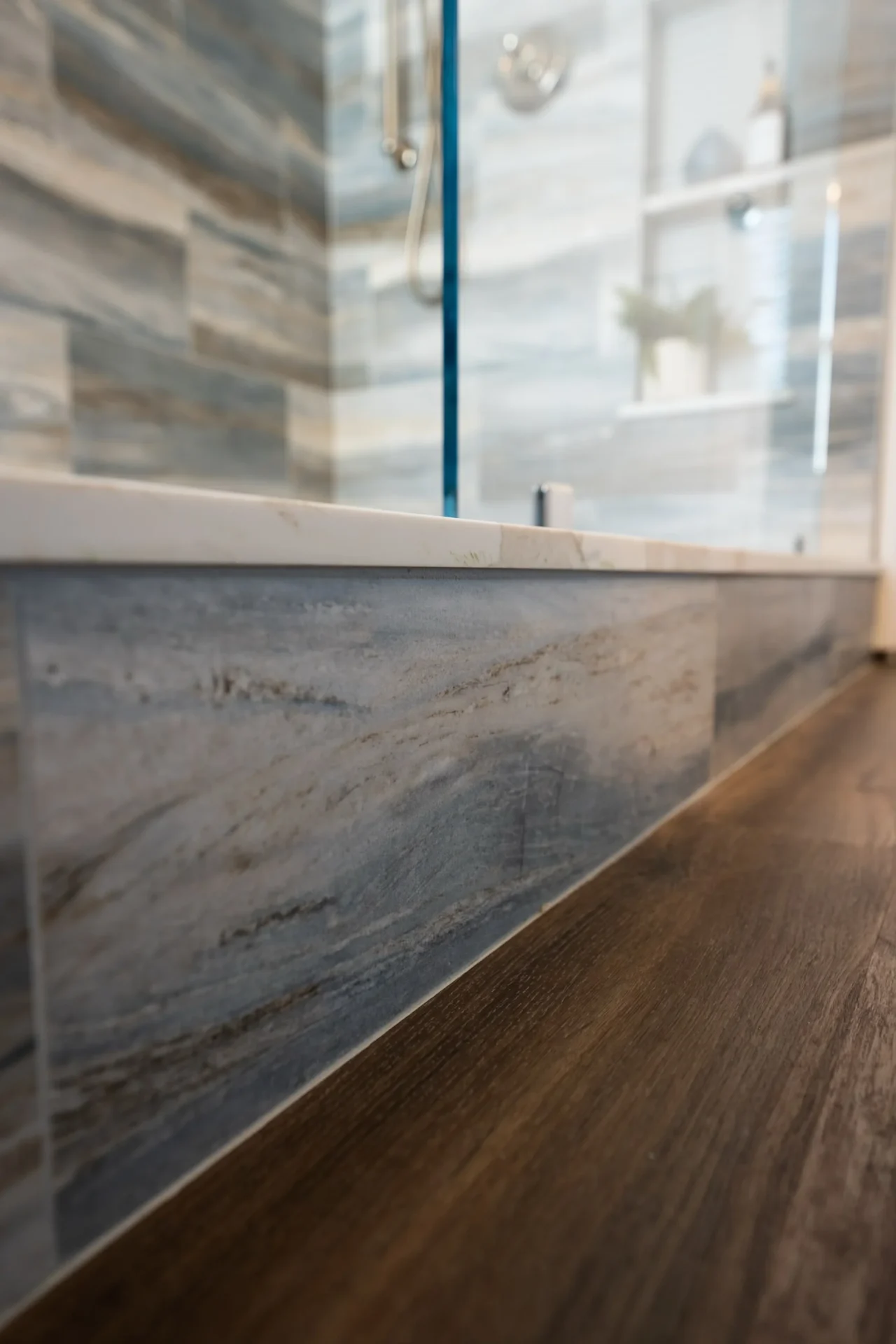 Our team replaced the builder-grade tub with an expansive, walk-in shower with seating under the window. The design blends casual blue and white tones with just the right amount of sophistication, creating a relaxing oasis. Our in-house designer helped Gary and Katie select every detail to ensure their vision came to life and the final result exceeded their expectations.