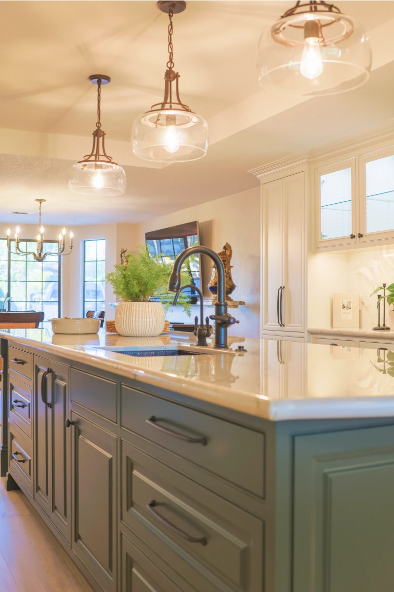 Our in-house designer worked closely with Dave and Carina to understand their vision, meticulously planning materials and layout for both functionality and aesthetics. For the kitchen, they chose an enlarged sink with cutting-board slide-ins and Mont Blanc Quartzsite slabs for the island. In the laundry room and adjacent bathroom, cabinets matching the kitchen were installed, alongside an expanded shower. The master bathroom features a free-standing luxurious soaking tub and ½” Starphire glass for the water closet enclosure and shower.